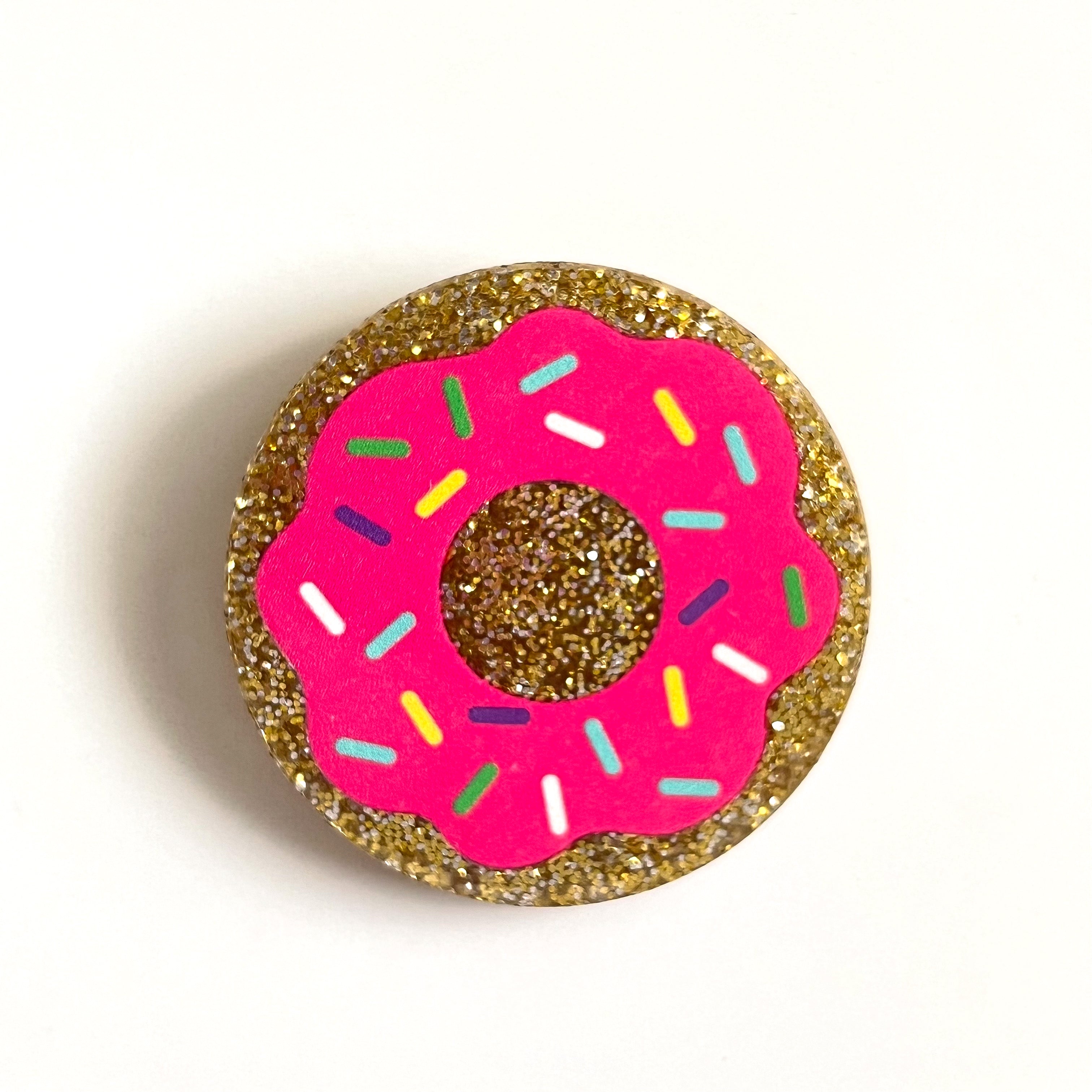 Acrylic Pink Glitter Donut Badge Topper + Reel